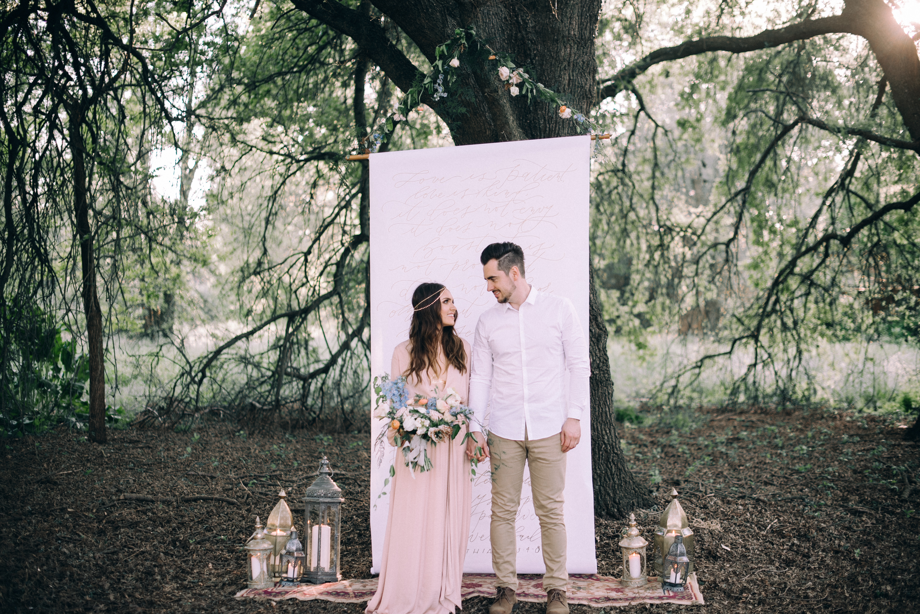 Whether you’re planning for boho wedding or vow renewal you need to have calligraphy! The gorgeous work done by Ashley Baumgartner paired so well with the overall airy and effortless look we were going for. The beautiful part of having custom calligraphy is that you can make your event very personalized and truly reflect you and your love! The ceremony backdrop was handwritten by Ashley and it was the couple’s favorite love poem. Having written out vows of course is an absolute must at a wedding or vow renewal but we decided to take it a step further and use scrolls to add more of a middle eastern and bohemian touch. The vows turned out so beautiful and eclectic on the stained scrolls!