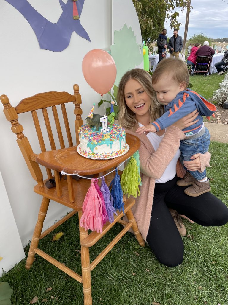 Now onto the cake! I am definitely a fan of cute smash cake but definitely not a fan of ordering an expensive custom cake only for it to be smashed and smeared all over the floor! Instead I opted for buying a cake from my local grocery store – Rayleys. Luckily for me, they usually always have a few options of cute kiddish cakes with sprinkles and that is exactly what I needed! After reviewing the options, I chose the 10 inch, white frosted cake with sprinkles that had a light blue glaze over the top. At home I customized the cake by adding a bit more sprinkles, well actually a lot more sprinkles. Then I added the number one candle, mini dinosaur figures and topped off with a tiny helium balloon. I was absolutely in love with how the cake turned out and it was not pricey! (Still had money leftover for a quick Starbucks run).