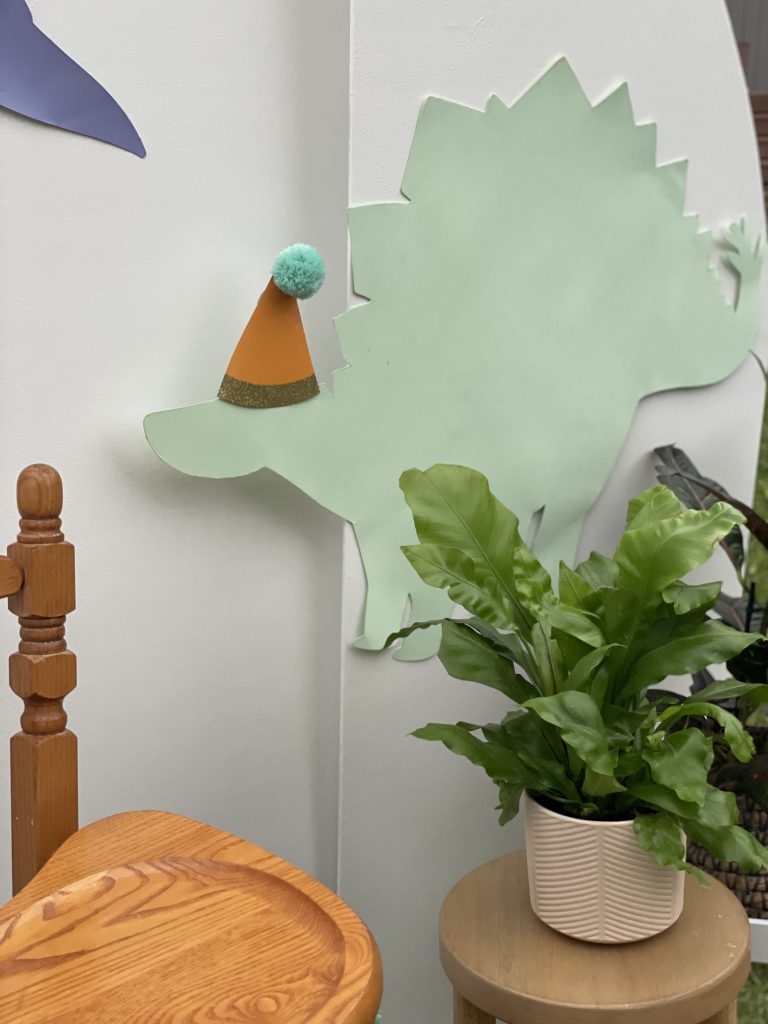 Let’s start with the backdrop! I bought the dinosaur cutouts from Dollar Tree and spray painted them in various pastel colors to achieve the “minimalist cutesy dino look”. Then, I topped them off with fun party hats from Target that I cut in half and attached to the dinos to which I added a 3D-sensory element by adding pom poms to the tops of the party hats. No party is complete without a birthday banner so I found the perfect pastel banner where I was able to use sticker letters to customize the wording. For the finishing touches, I ordered helium balloons to frame the backdrop instead of making a balloon garland. Don’t get me wrong, I LOVE a good balloon garland and I hope they never go out of style but there’s something about classic helium balloons that is so cute and nostalgic. They are also a cheaper balloon option and were a huge hit with the kiddos too! Little ones always love to play with helium balloons 🙂 It’s not a first birthday without a highchair. It’s perfect to place the smash cake on and keep the little one in place for photos. I kept the high chair decorations pretty simply and just added a cute little tassel garland across the front, of course also in pastel tones. Then to finish off the backdrop, I added some real and faux plants from around the house for a Jurassic and tropical look to the design but still keeping with the overall minimalist look I was going for. Overall the backdrop turned out visually simple and not overstimulating yet fun and amusing for the little ones and guests!