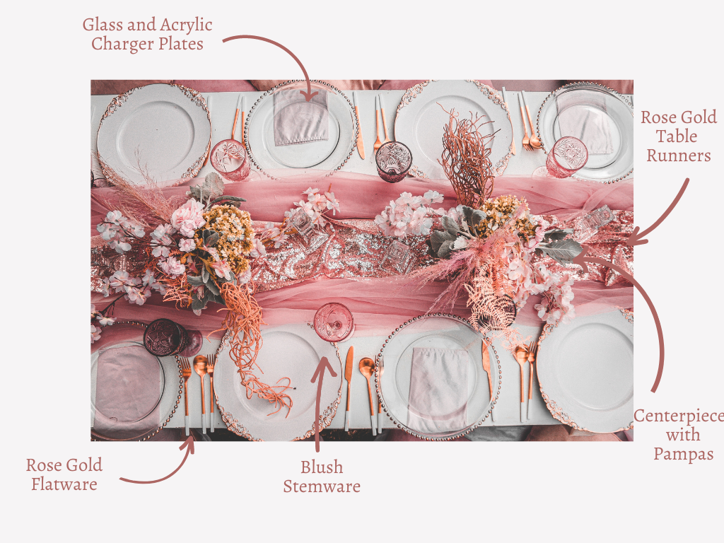Links to rent the decor: Table Runners Rose Gold Flatware  |  Blush Stemware  |  Charger Plates