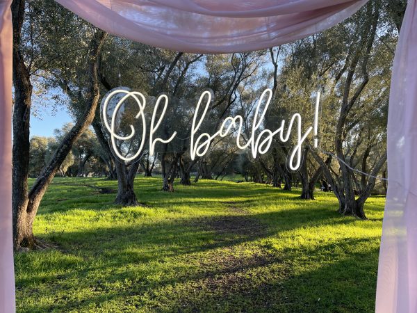 – clear power cords come out of the both bottom right corner and bottom left of the sign. both cords connect to main power adapter that plugs into the wall.
