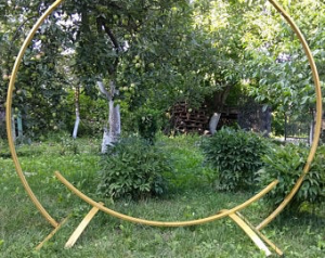 This easy to assemble, matte gold metal ceremony structure stands 7.5 ft high and can be set for a “passable” (full circle) or an “impassable” mode. Structure is set down behind stage in picture referenced above.