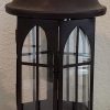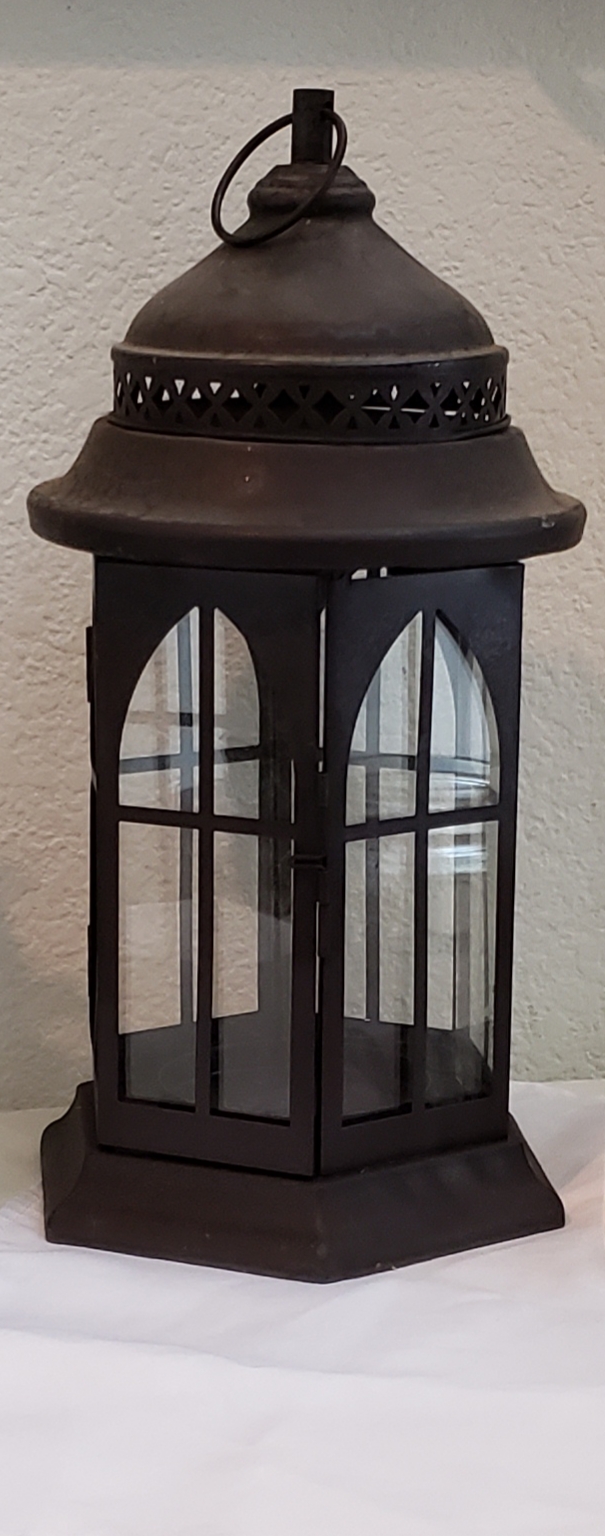 These black lanters are made of iron and have glass side panels. Have a single latching, swinging door.