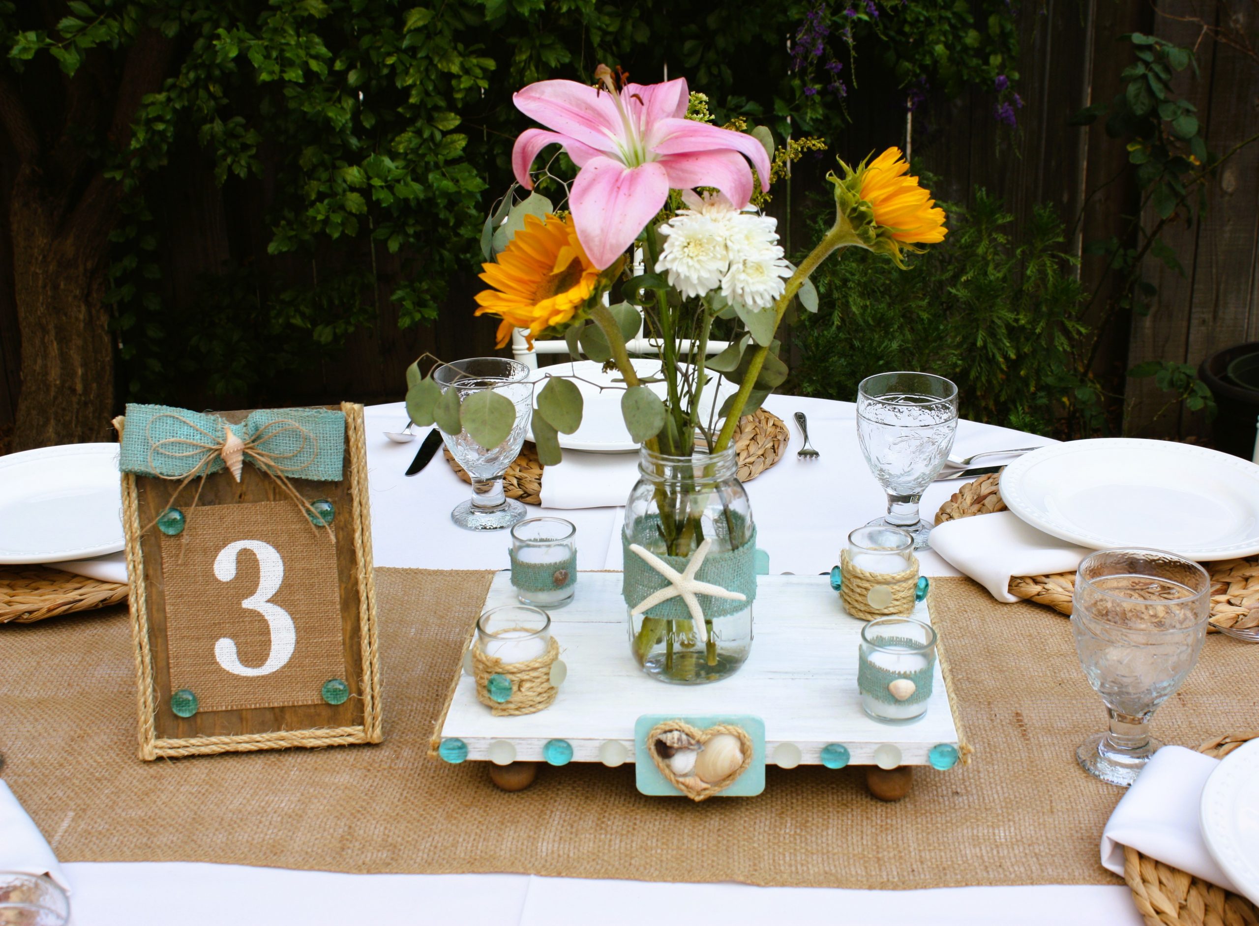 A white table number is hand painted on burlap and decorated with soft turquoise hued beach pebbles. Wood is pine and stained in special walnut.