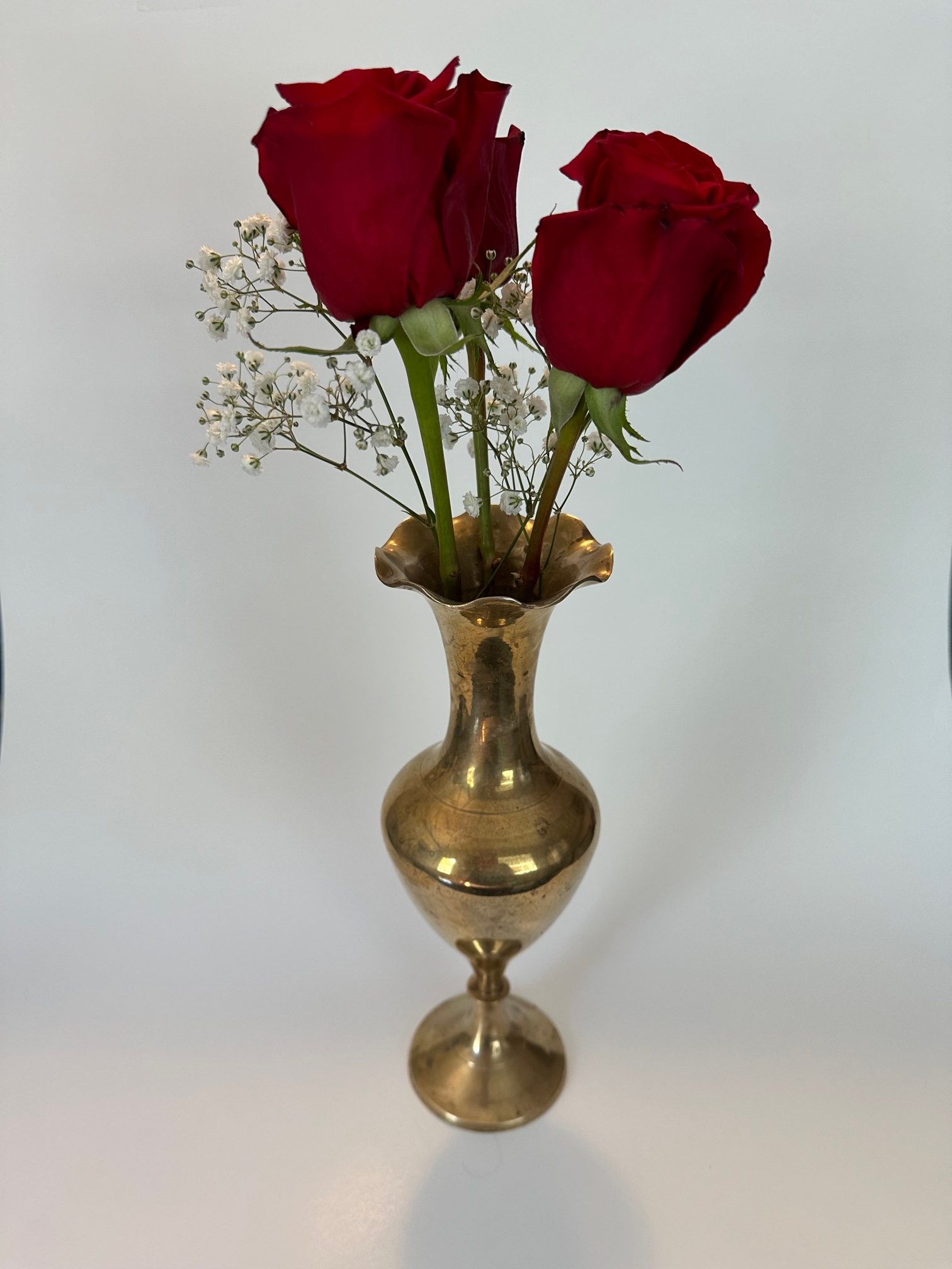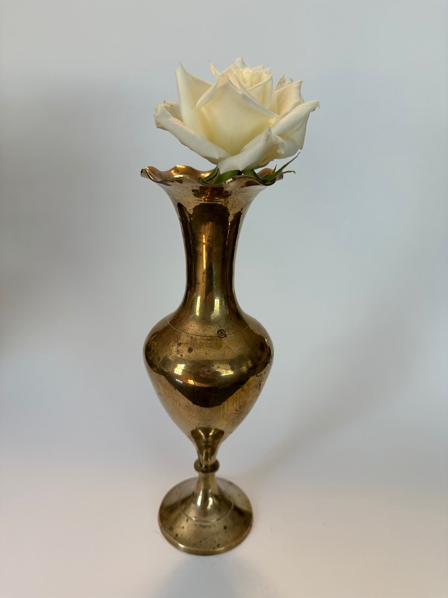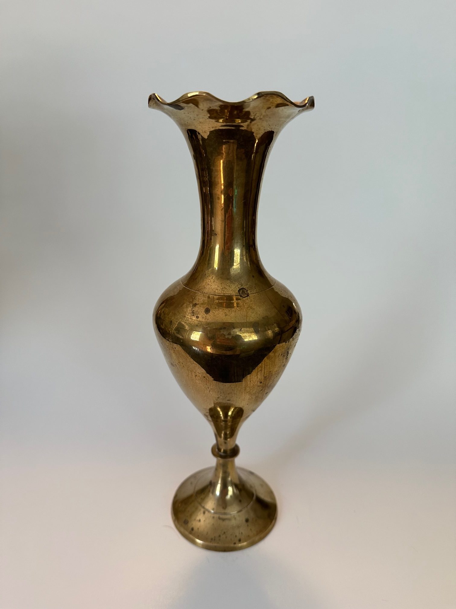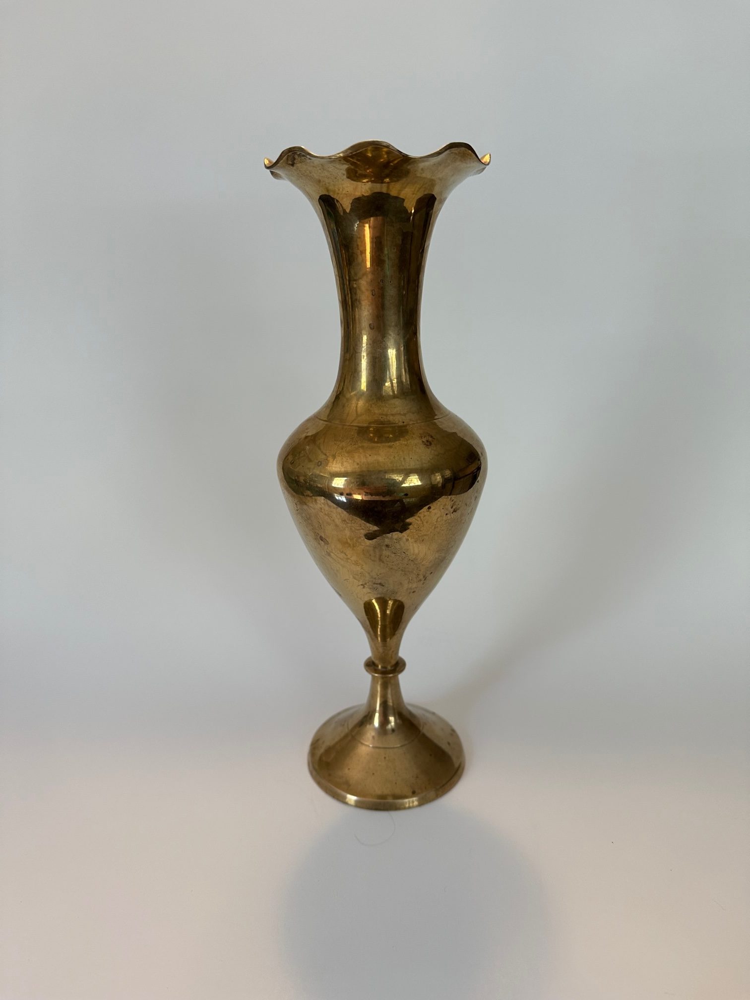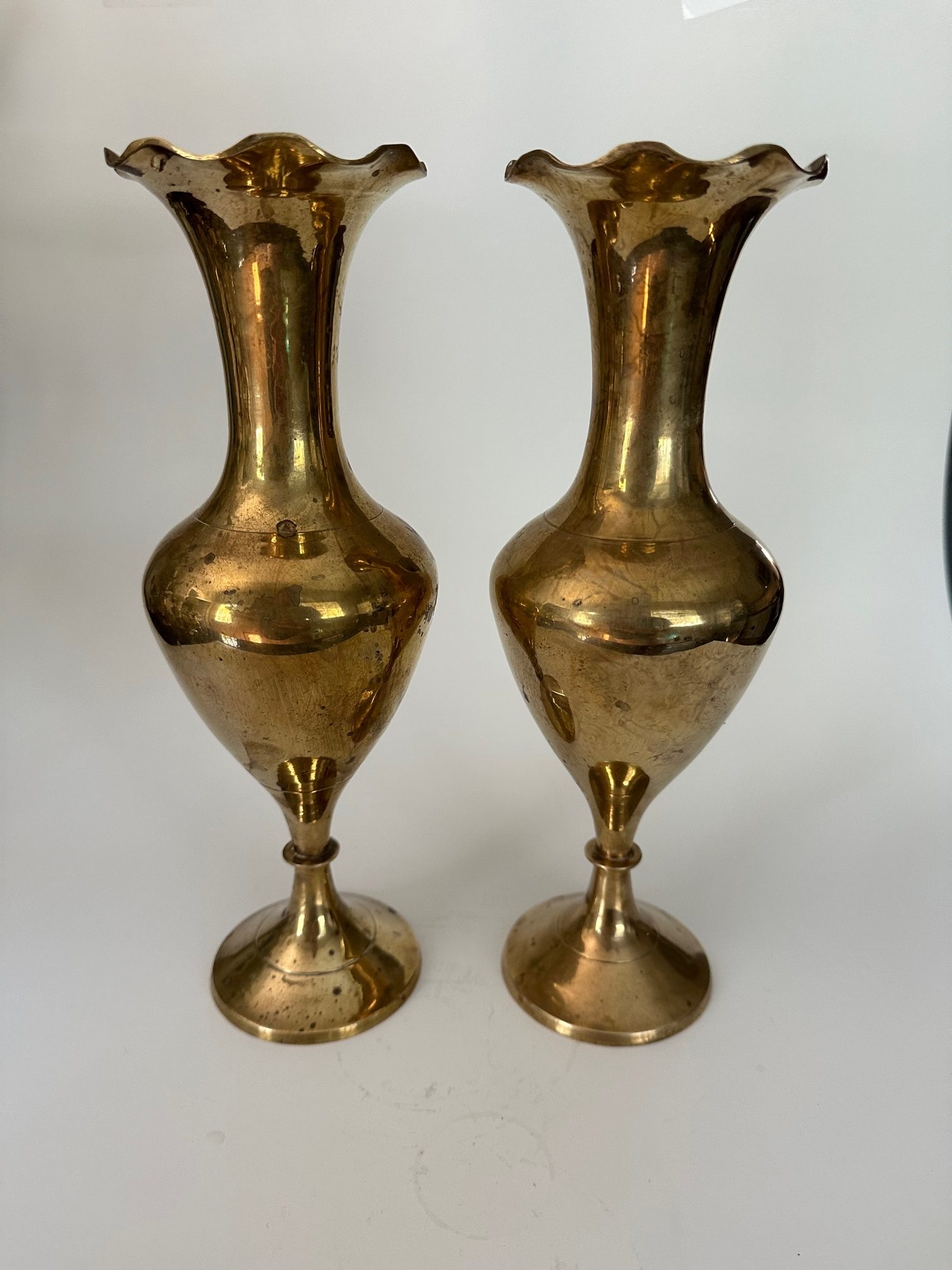 Stunning set of genuine antique brass vases with scalloped detailing on the rim. Will add the perfect gold touch for your wedding, showers and special events!