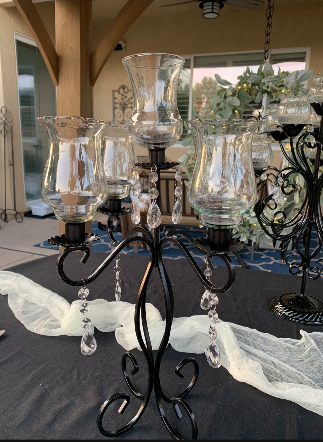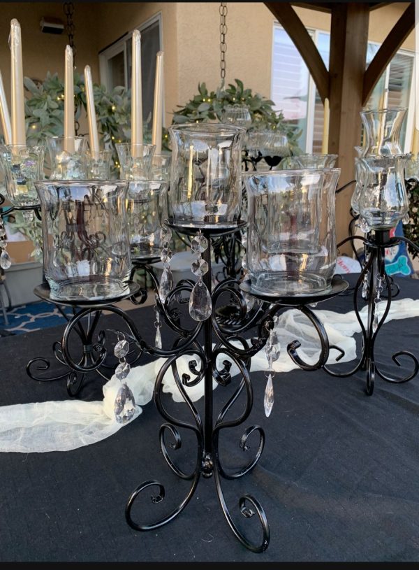 All are painted black and have clear glass crystals hanging from arms.