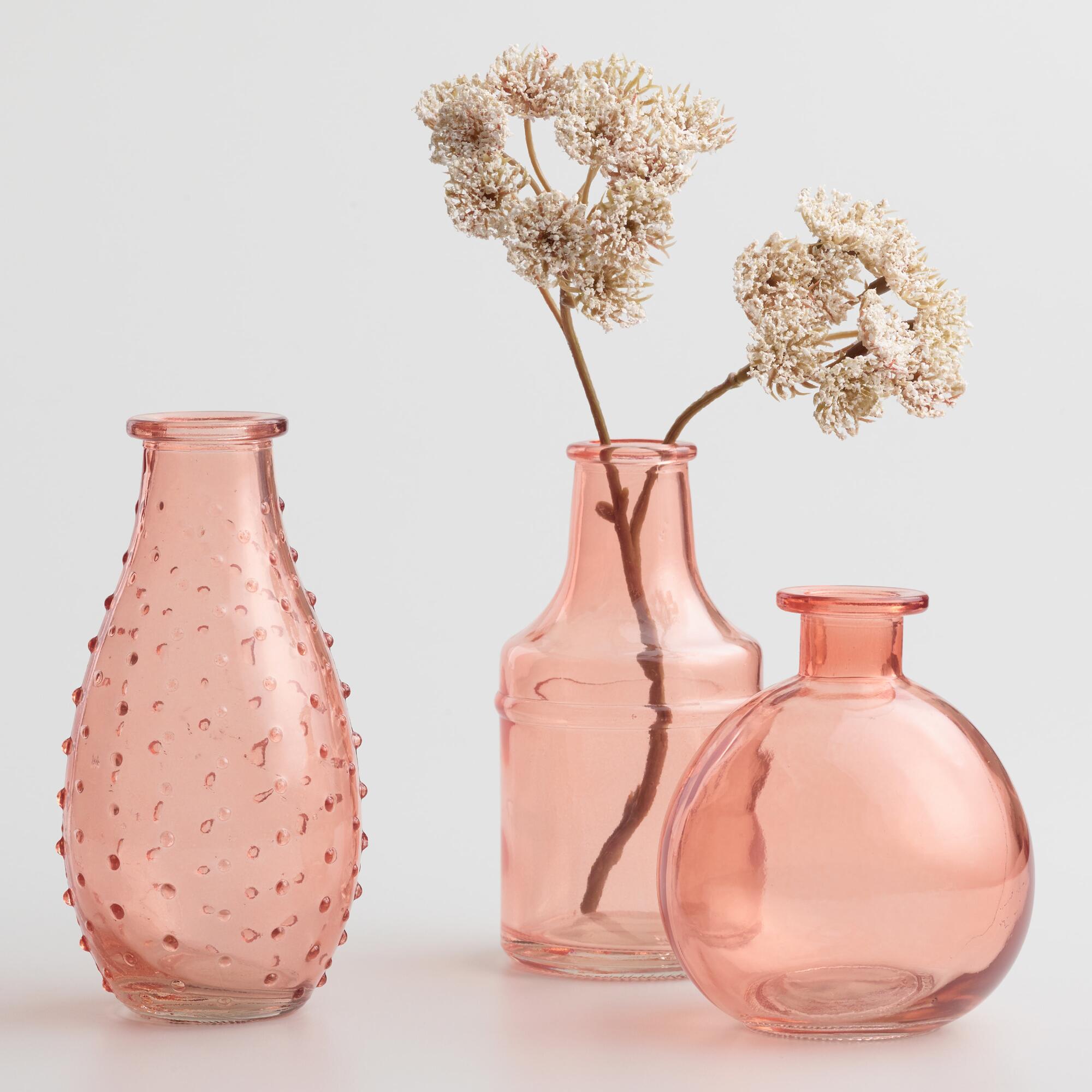 Coral/ Pink bud vases. Comes as a set of three including 3 different shapes and sizes.
