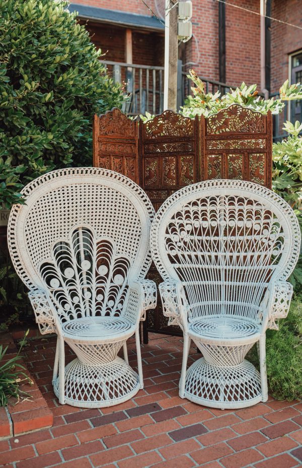 White Elephant Co. Event Rentals – “The Olin” White Peacock Chair rental. All white wicker rattan peacock chair with ornate fan back seat. A gorgeous addition to any event. *PLEASE NOTE* – “The Olin” is shown as the chair to the RIGHT in photos. Contact us for more available vintage furniture and decor!