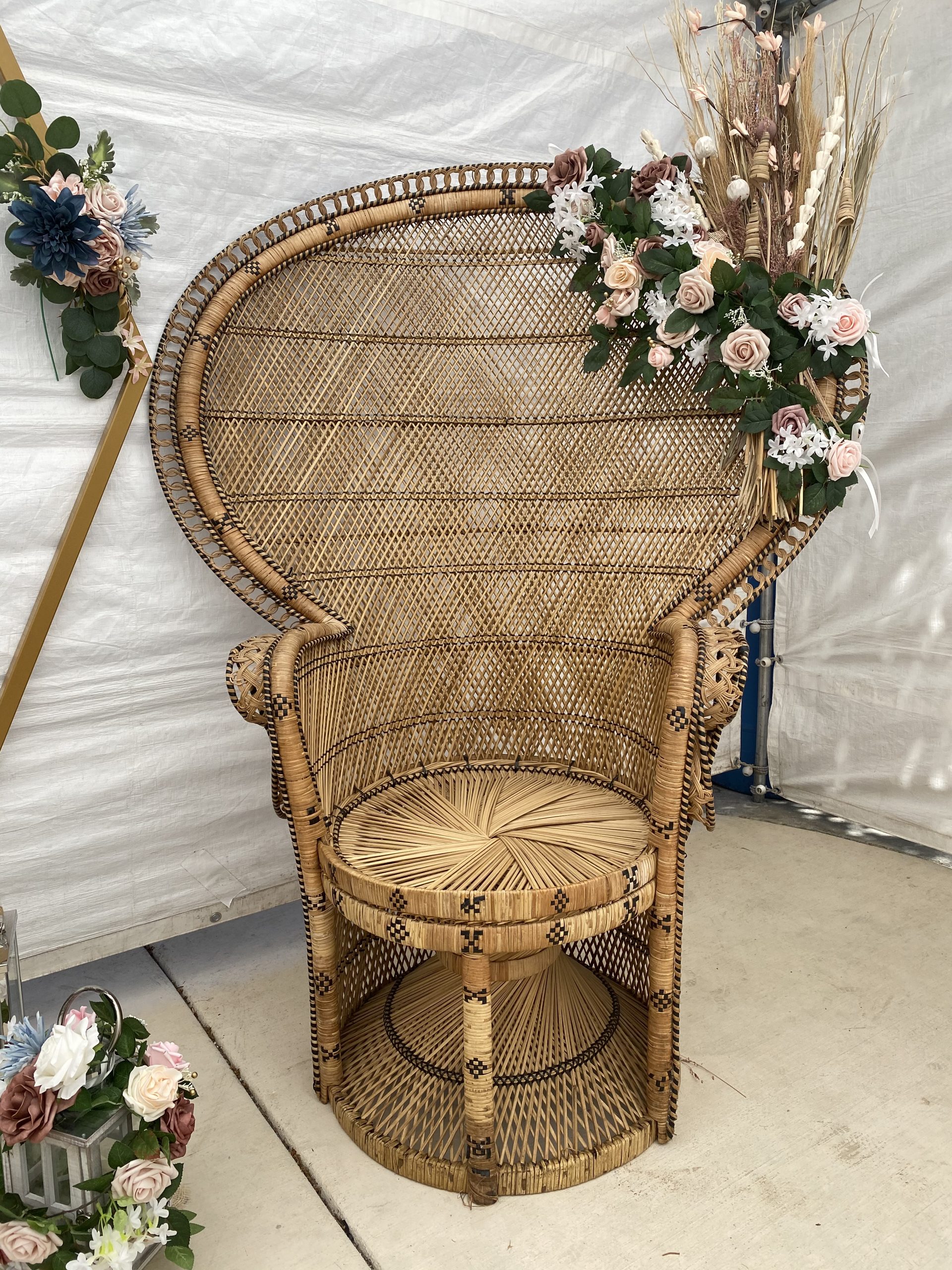 White Elephant Co. Event Rentals – “Chi’s Classic” Peacock Chair. Large vintage peacock chair with fan back and ornate black and beige pattern. Contact us for more available vintage furniture and decor!