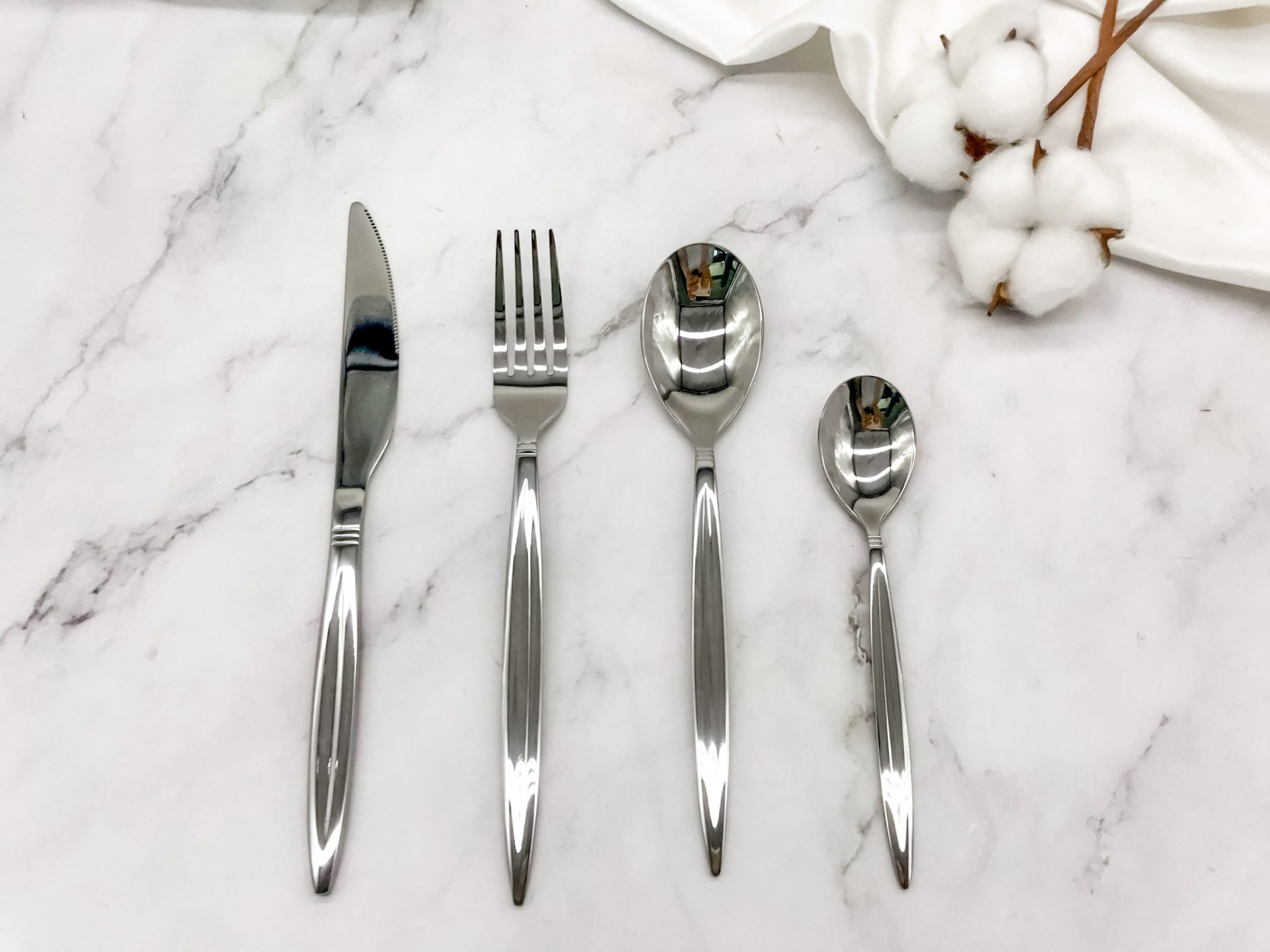 - 4pc set includes Dinner Knife, Dinner Spoon, Dinner Fork, and teaspoon.