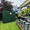 8 foot Boxwood Living Champagne Wall with two side walls and  four camouflaged openings for two servers to pass drinks through as guests ring the bell.