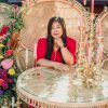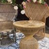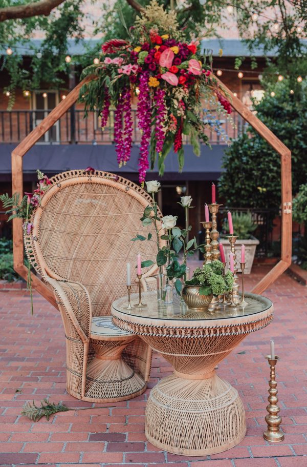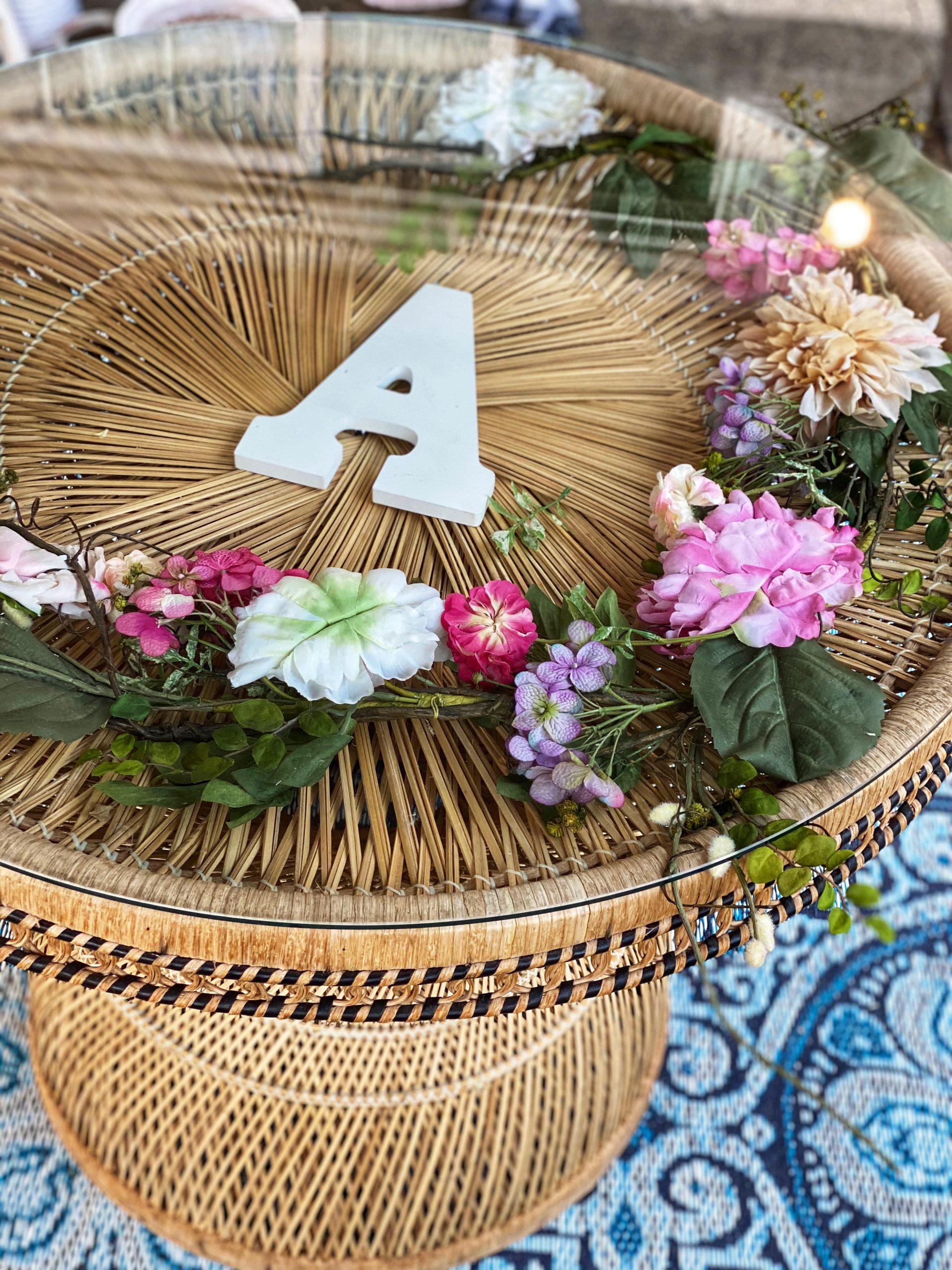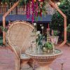 Gorgeous vintage round “peacock” table with glass top. 36″ in diameter. Size makes a perfect sweetheart table to pair with any one of our 16+ peacock chairs. Contact us for more available vintage furniture and decor!