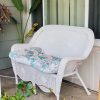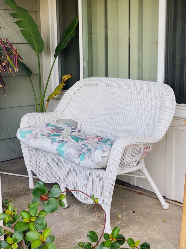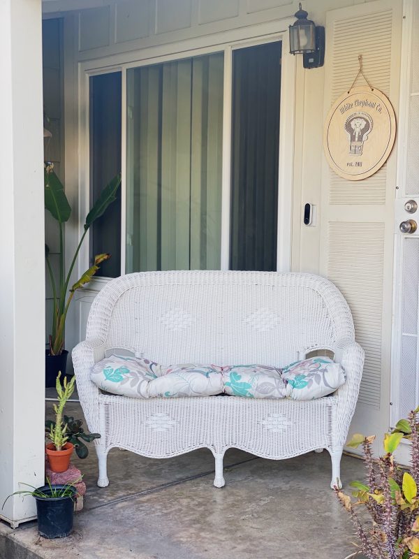 Beautiful white resin wicker loveseat, seats two comfortably. Made of durable plastic-resin (not actual wicker); lightweight yet sturdy. Cushion is optional. Use this for your party, photoshoot, wedding, interior styling needs, or staging. Contact us for more available vintage furniture and decor!