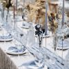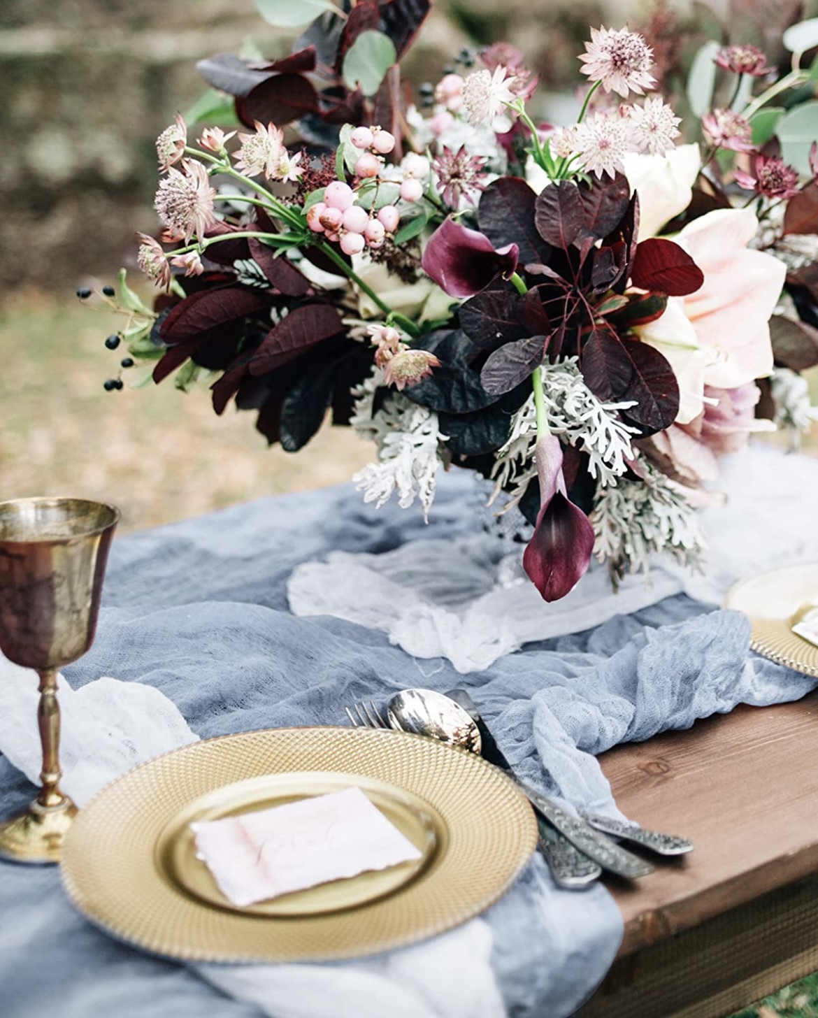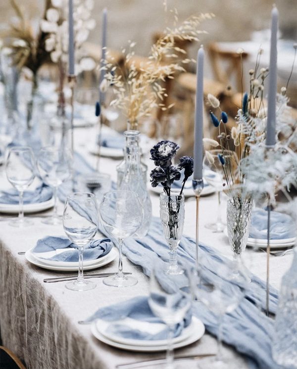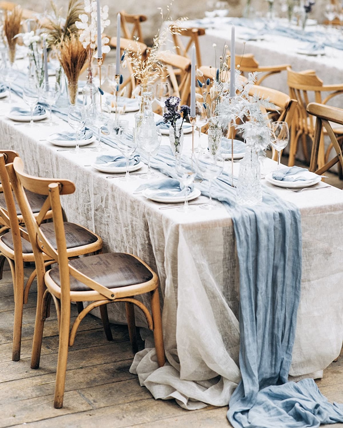 - Dusty Blue cheesecloth table runner with wrinkled gauze fabric.