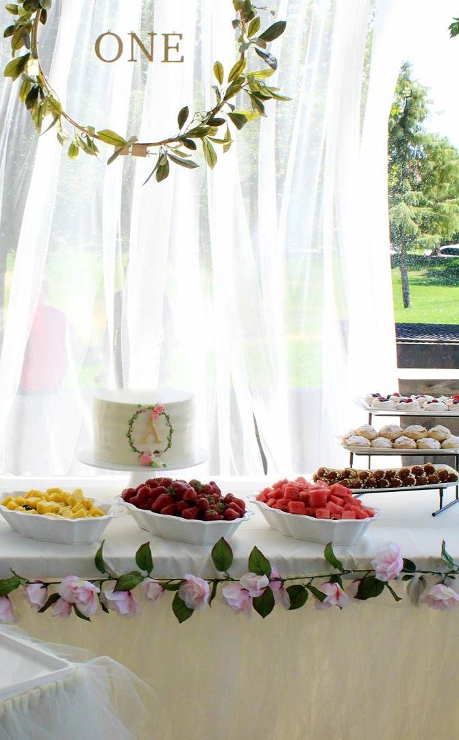 Beautiful pink floral garland. Standard size – good for a six foot table as pictured above.