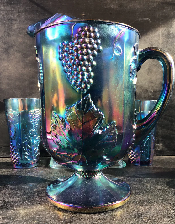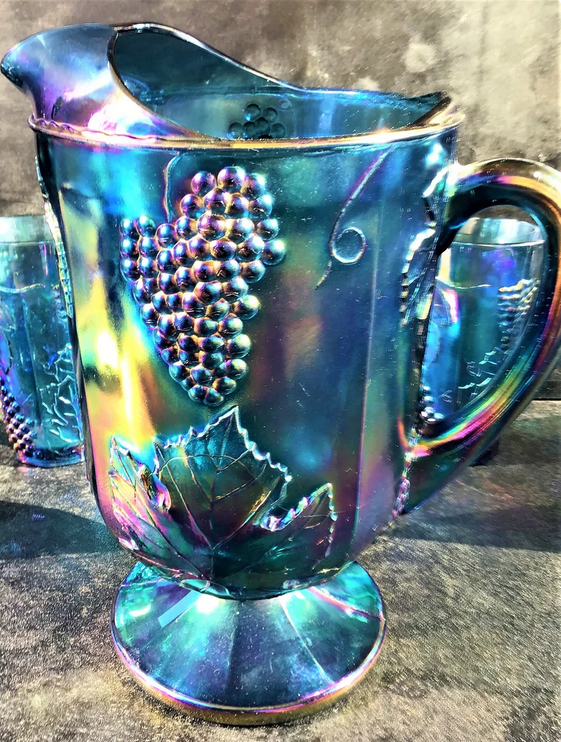 - Harvest Grape Iridescent Glass Blue Pitcher $30.00 ea.