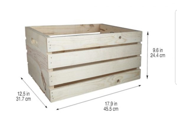 Crates measure 18″ long. 9.5″ tall. 12.5″ deep.